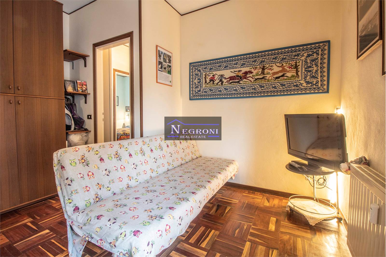 L'appartamento, di circa 50 mq, è situato a piano terzo ed è composto da: ingresso, disimpegno, caratteristico soggiorno con balcone panoramico, cucinotto separato, camera matrimoniale, bagno completo e finestrato.